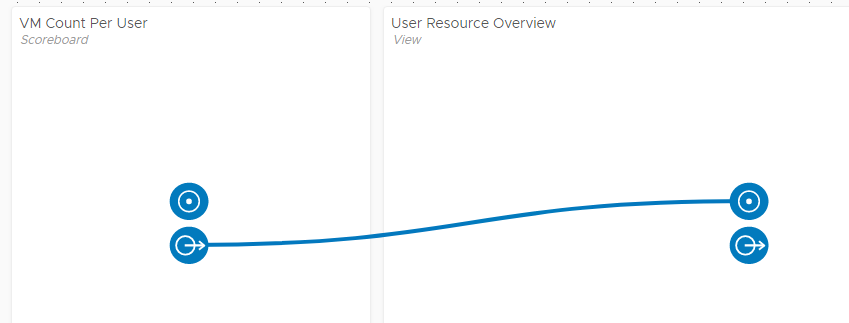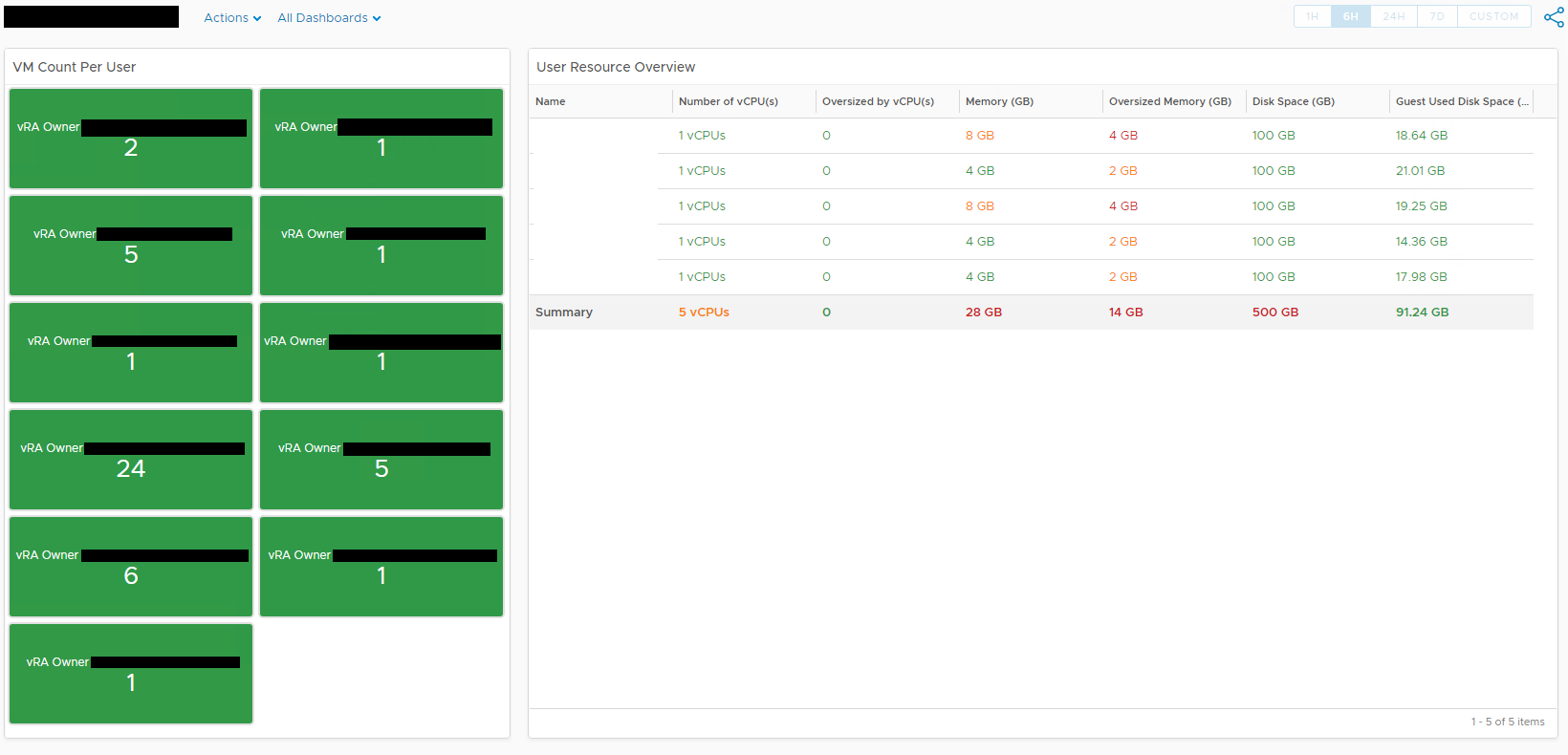 The left widget shows for each user how many VMs they have deployed. After selecting a user from the left widget, the right view widget is populated with resource information.